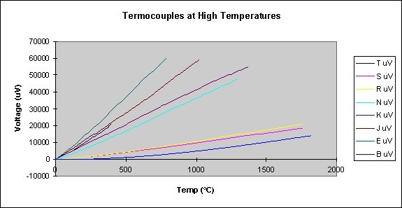 以下圖表顯示的是在不同溫度時(shí)熱電偶輸出的電壓值。注意白金熱電偶的輸出電壓較小,這就正好說明了為什么它們不能被用于高溫測(cè)量。 | |||||